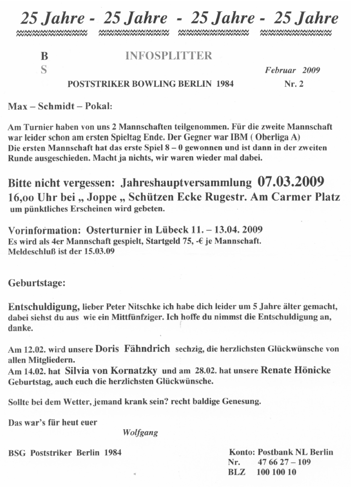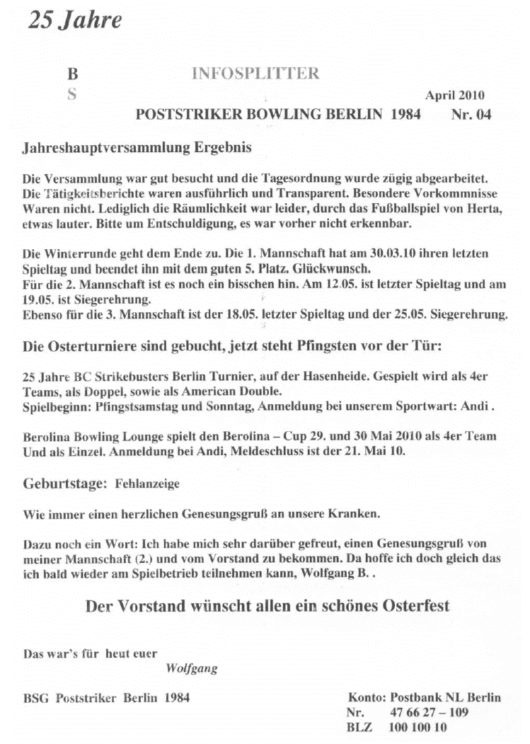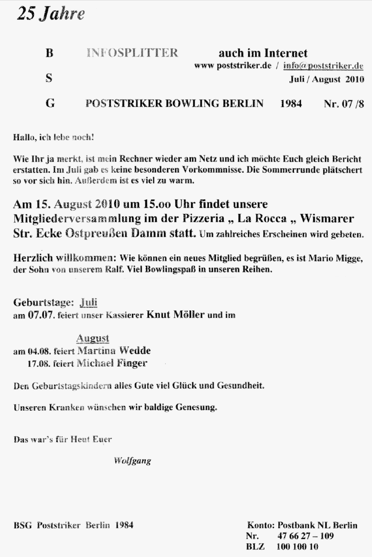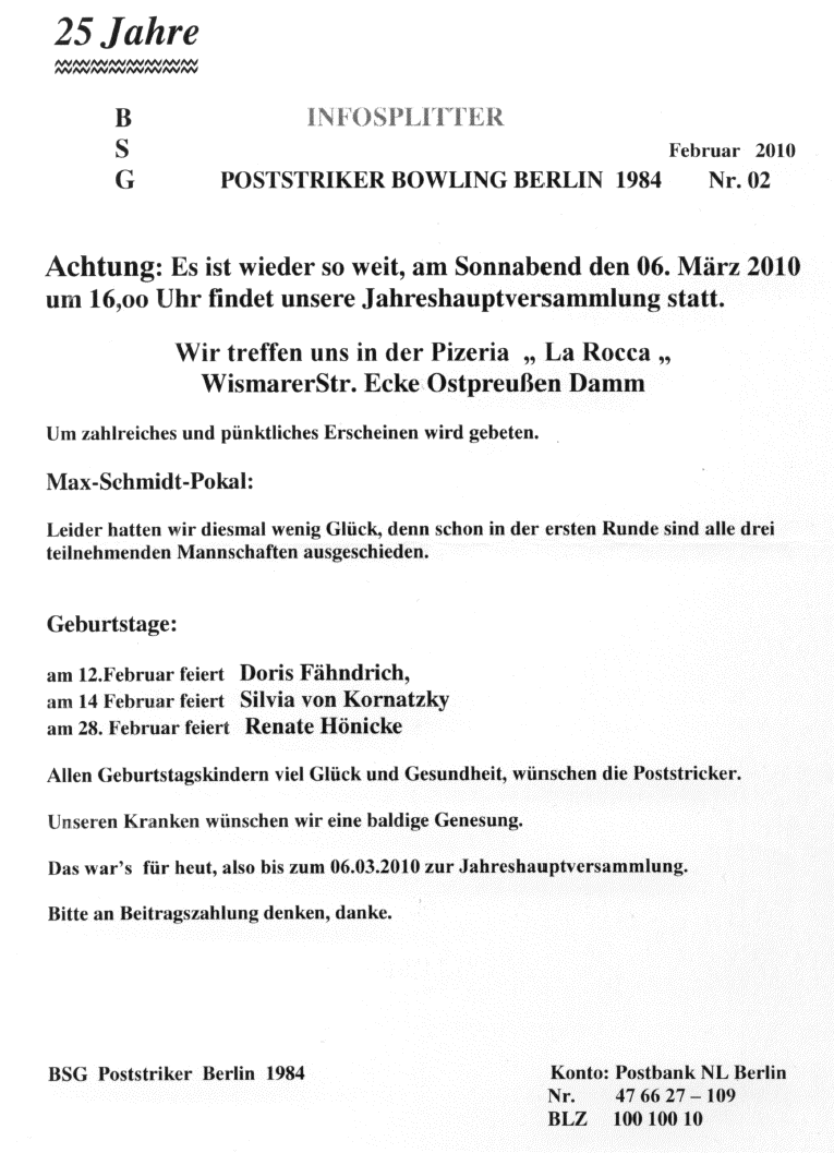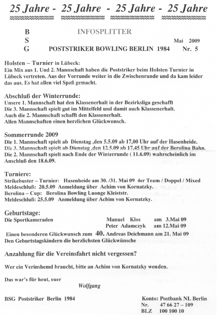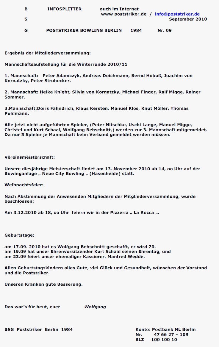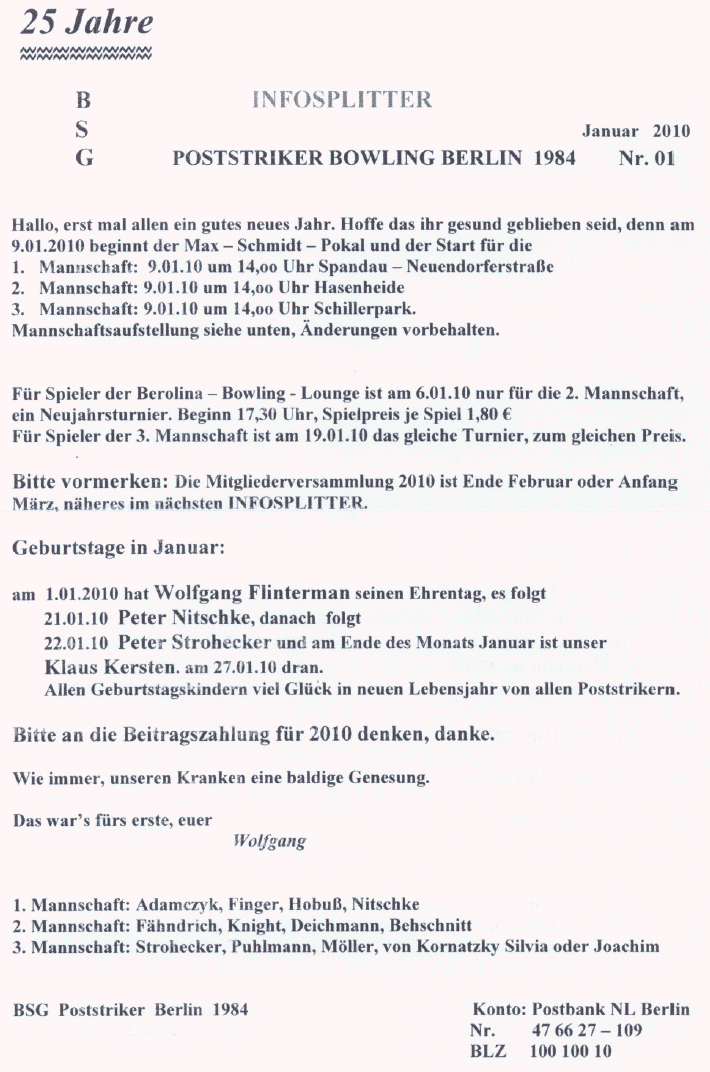 BSG Post Striker Berlin 1984 - Konto: Postbank NL Berlin - IBAN: DE17 1001 0010 0476 6271 09