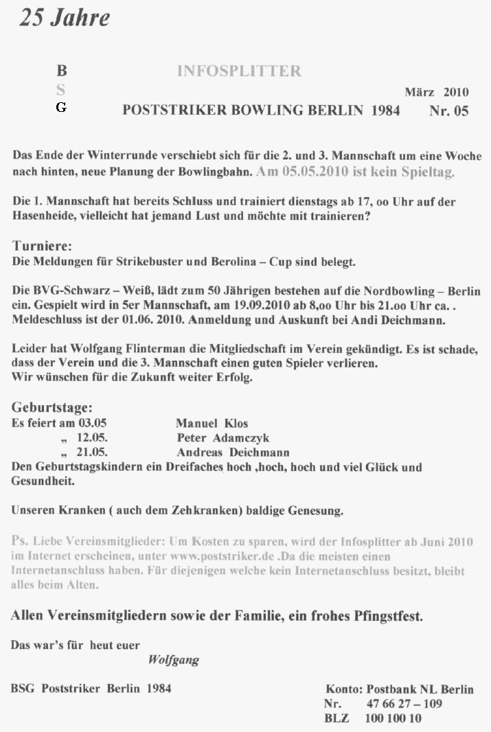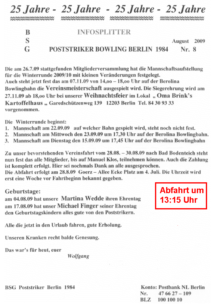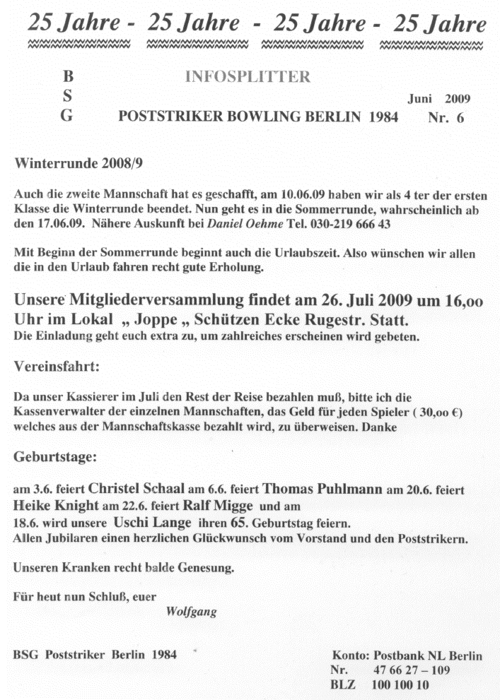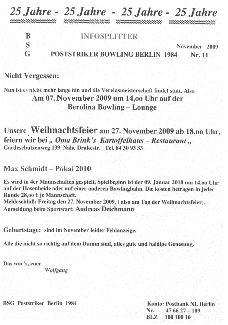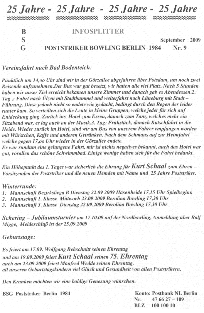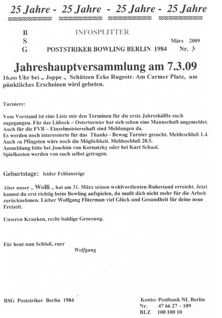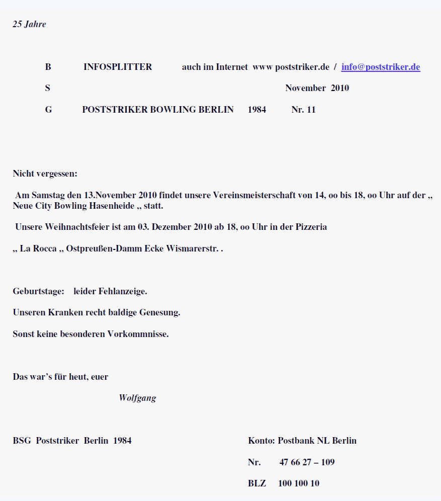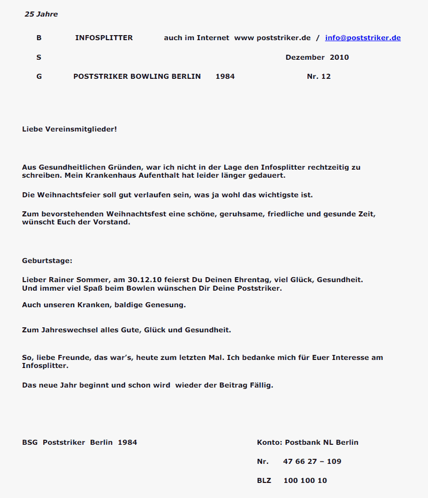BSG Post Striker Berlin 1984 - Konto: Postbank NL Berlin - IBAN: DE17 1001 0010 0476 6271 09