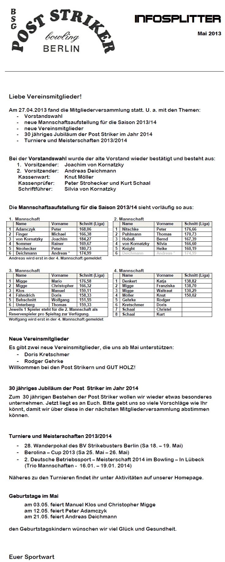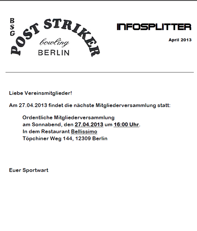 BSG Post Striker Berlin 1984 - Konto: Postbank NL Berlin - IBAN: DE17 1001 0010 0476 6271 09